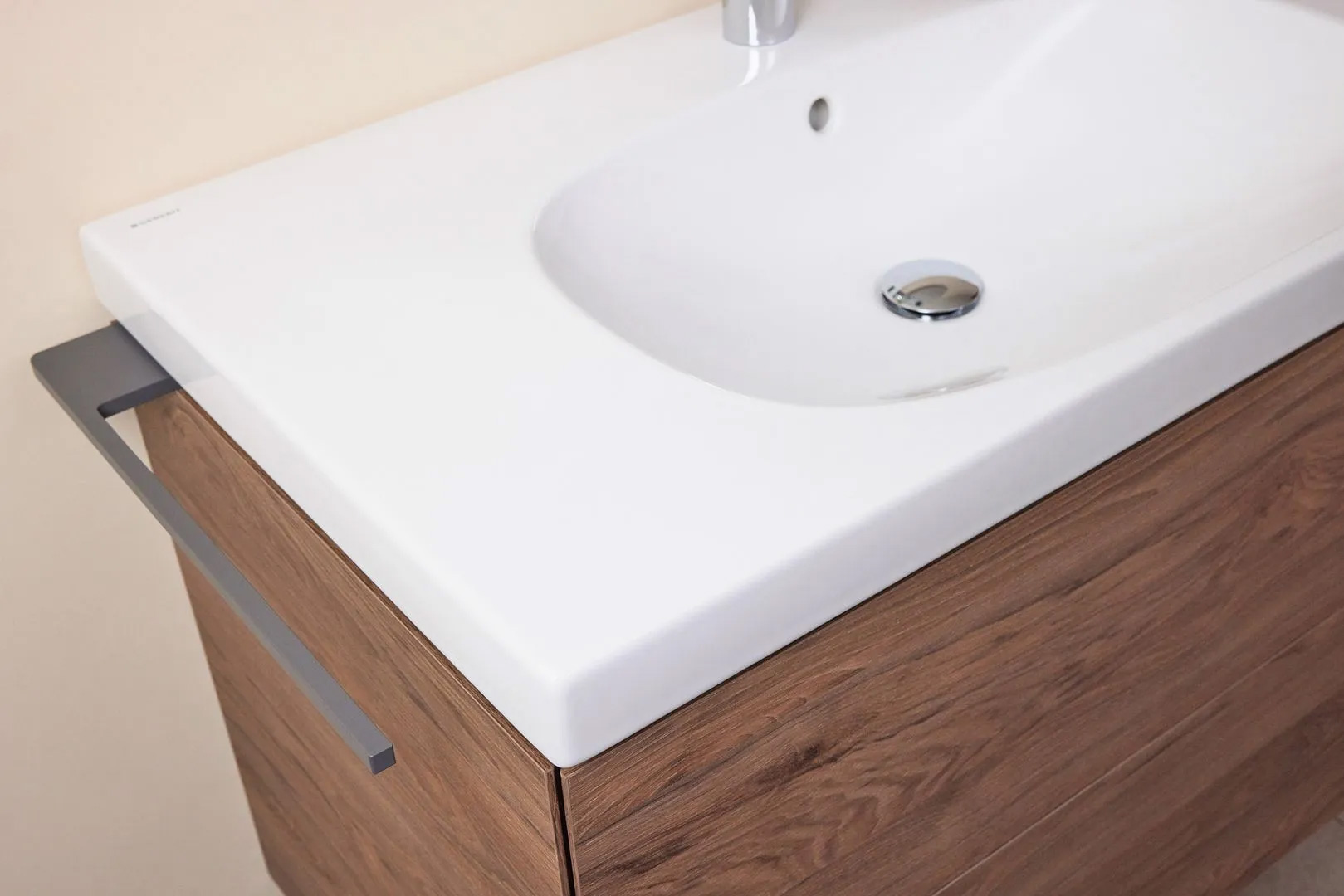 Wie ein Flügel schwebt der filigrane Mineralguss-Waschtisch über dem Korpus. Aus dem Rückschwung der sich auch nach oben verjüngenden Waschtischkante ergibt sich die seitliche Griffmulde. Optisch setzt sich damit der Schwungansatz der unteren Griffmulde fort, über die sich die beiden tiefen Auszüge öffnen lassen.
